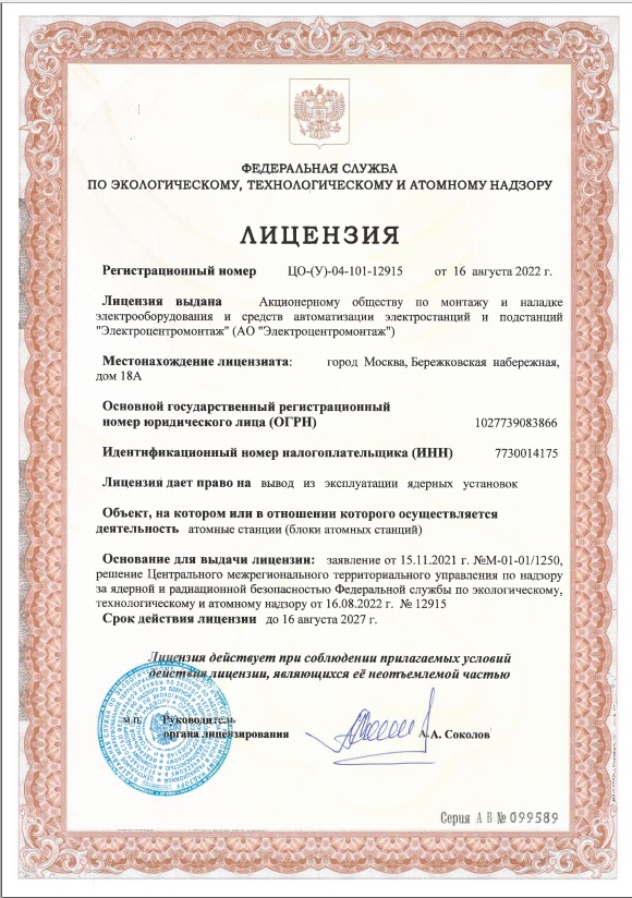 АО «Электроцентромонтаж» получена лицензии № ЦО-(У)-04-101-12915 на право вывода из эксплуатации ядерных установок, объект на котором или в отношении которого осуществляется деятельность: атомные станции (блоки атомных станций). Срок действия лицензии 5 лет.